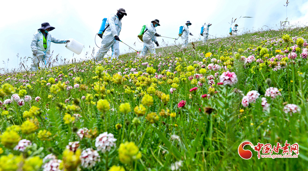 盛夏時節(jié),位于張掖市肅南裕固族自治縣的皇城夏日塔拉草原、康樂賽汗塔拉草原,宛如一塊巨大的綠色絨毯鋪向天際,滿目翠綠,令人心醉神迷。然而,此時也正是草原上狼毒花毒害草盛放、蝗蟲繁殖的高峰期。連日來,肅南縣林草專業(yè)技術(shù)人員帶領(lǐng)2000多牧民,抓住毒害草開花、蝗蟲繁殖最快,也是清除滅殺的最佳時機(jī),在“三北”工程六期160多萬畝廣袤的草原上,打響了以“蟲害防治+害草治理+噴施葉面+播撒草籽的”為核心的“三北”工程林草濕荒一體化保護(hù)修復(fù)攻堅戰(zhàn)。
