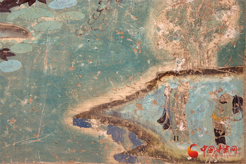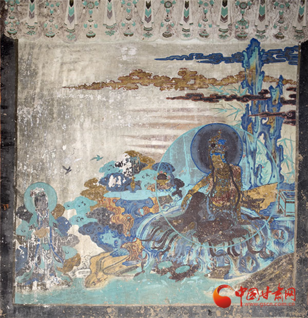 兩幅作品均以青綠色調(diào)為主,觀音面部貼金雖已氧化,卻仍顯清新淡雅,更以“馬一角、夏半邊”的構(gòu)圖巧思,用對(duì)角線分割畫(huà)面、大量留白,讓有限的壁面生出無(wú)窮空間感,堪稱中國(guó)傳統(tǒng)美學(xué)與佛教哲理的完美融合——正如唐代白居易贊水月觀音“凈淥水上,虛白光中”,這般意境在榆林窟的壁畫(huà)里被演繹得淋漓盡致。