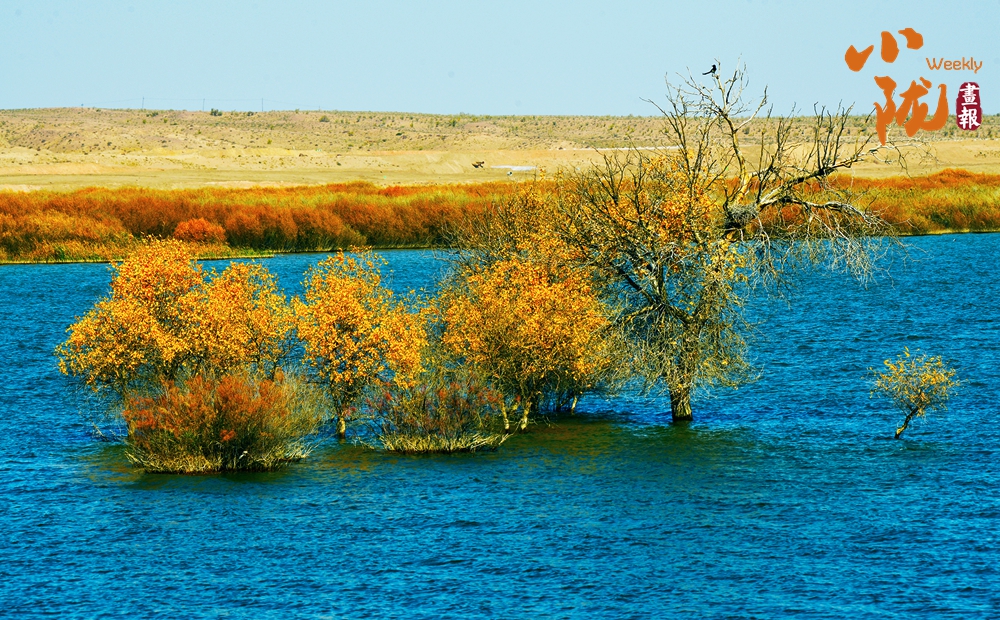 天藍(lán)藍(lán),水藍(lán)藍(lán),水天一色。紅柳簇?fù)沓裳妫紵谒醒?,顯得格外奪目,展現(xiàn)出荒漠特有的壯美與生機(jī)。