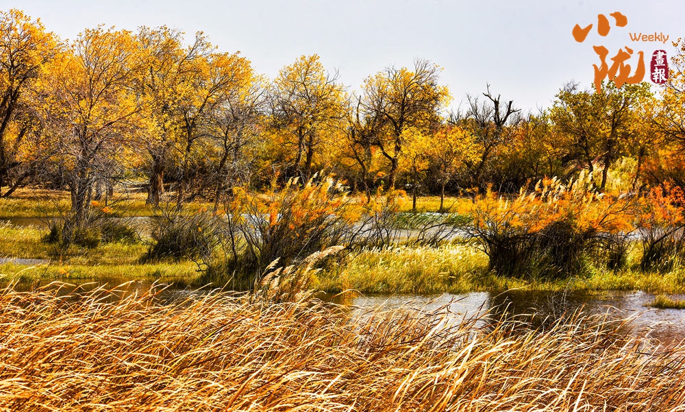 金色胡楊在陽(yáng)光下泛著溫暖光澤,斑斕絢麗的蘆葦如金色絲帶點(diǎn)綴荒漠,與碧綠河水、湛藍(lán)天空構(gòu)成濃墨重彩的秋日?qǐng)D景。