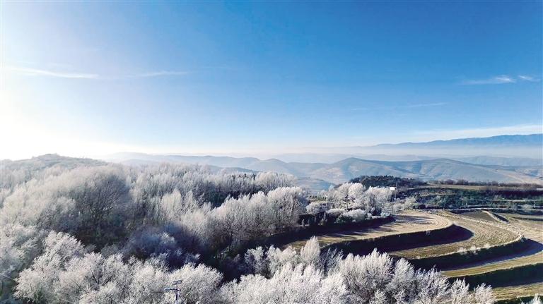 12月17日,一夜寒風(fēng)拂過榆中縣韋營(yíng)鄉(xiāng),喚醒了千樹萬樹的冰瑩之花。舉目望去,漫山遍野如披輕紗,萬物凝結(jié)成潔白晶瑩的畫卷,移步皆景讓人心曠神怡。