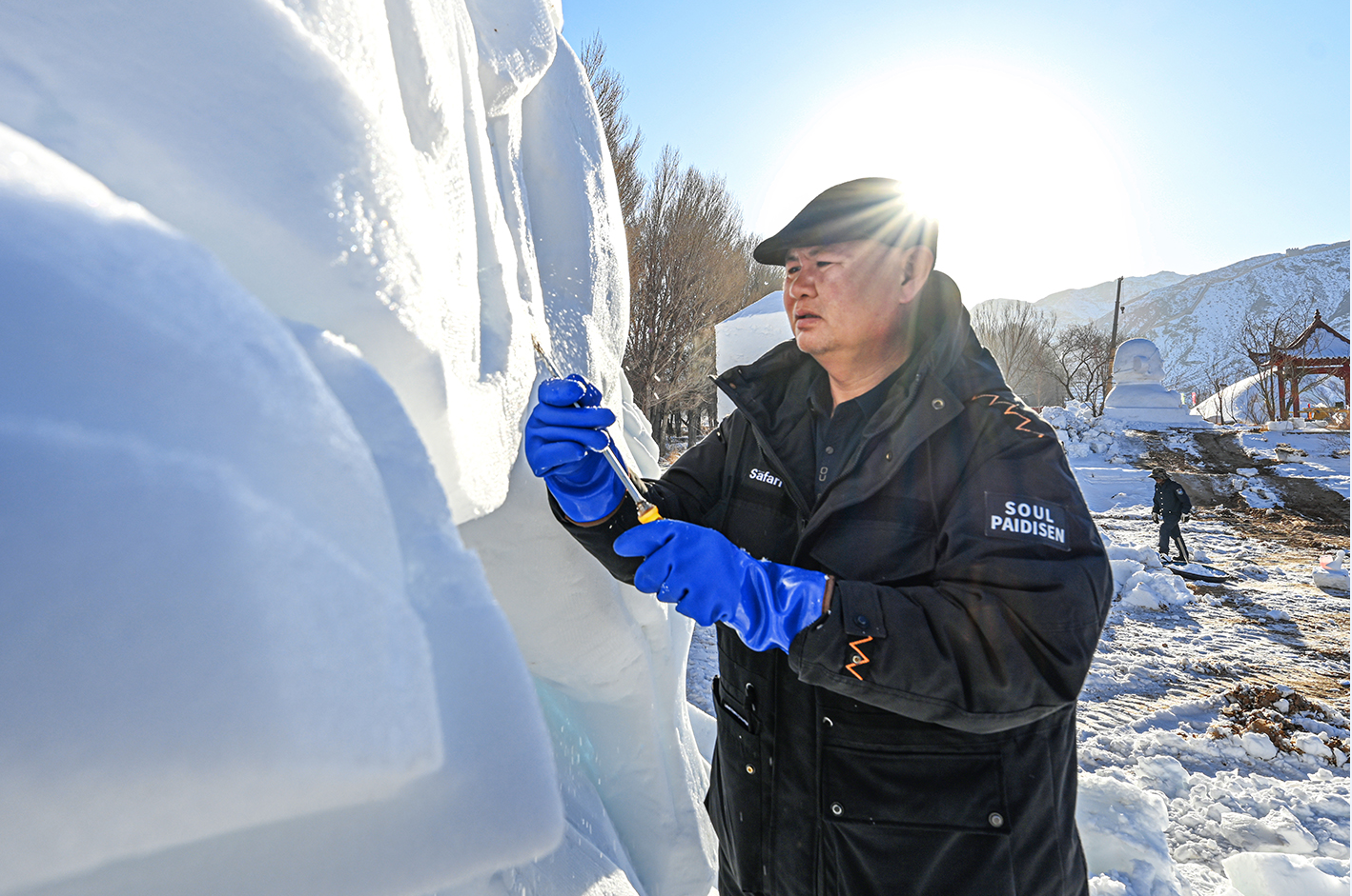 中國甘肅網(wǎng)1月13日訊 據(jù)嘉峪關(guān)日報報道(融媒體中心記者 李巍 攝)揚(yáng)鏟塑造型,落刀雕精彩。1月10日,懸壁長城腳下,《昭君出塞》《九尾靈狐》《喜財神》等雪雕作品,在匠人們的精雕細(xì)琢中漸漸揭開“面紗”。