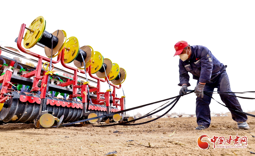 3月12日,張掖市高臺(tái)縣巷道鎮(zhèn)殷家橋村綠色高效小麥種植基地上,農(nóng)戶們?cè)诓シN中進(jìn)行滴灌帶的接續(xù)。